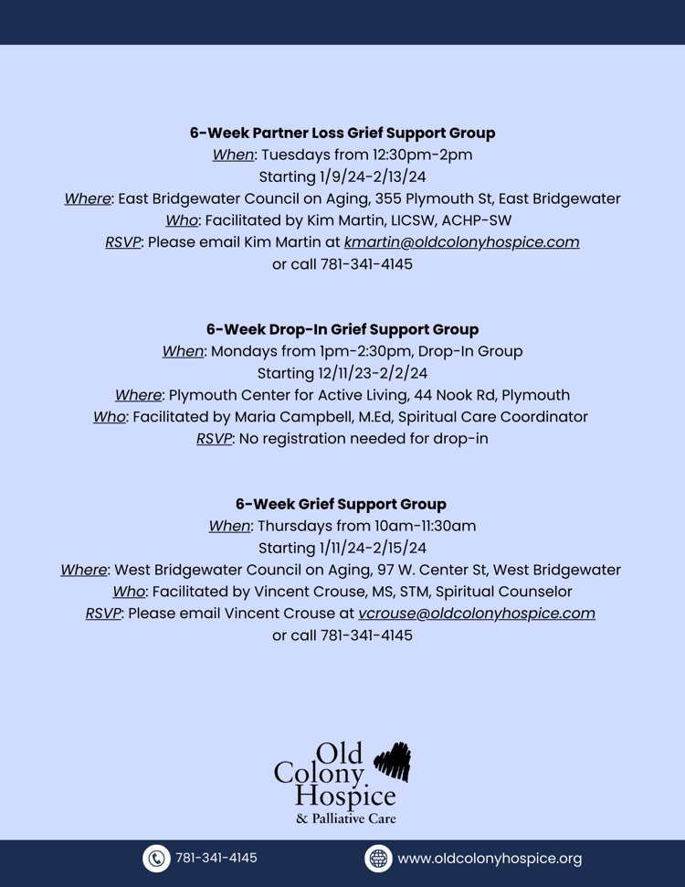 Old Colony Hospice has several support groups available. These groups are free of charge and open to the community.